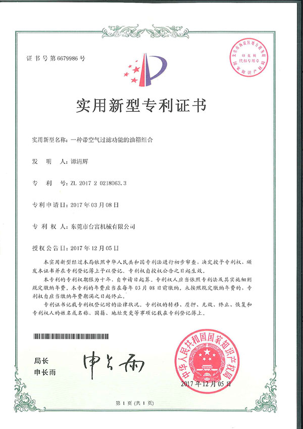 一種帶空氣過(guò)濾功能的油箱組合專(zhuān)利證書(shū)