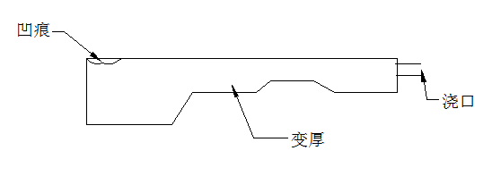 壁厚的部位出現(xiàn)縮孔或光澤,是因?yàn)楸砻鎸記](méi)有形成堅(jiān)固的固化層,當(dāng)中心部收縮時(shí)會(huì)將表面向內(nèi)拉成縮孔,甚至由內(nèi)向外擴(kuò)散的熱量會(huì)將表面層再度熔解而出現(xiàn)光澤。